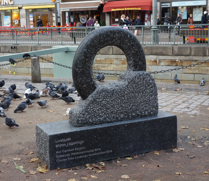 Livshjulet-Möten i ögonhöjd, Brunnsparken, Göteborgs stad, 2014, skulptur av larvikit, höjd 150 cm.